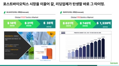 포스트바이오틱스 시장을 이끌어 갈, 리딩업체가 탄생할 바로 그 타이밍. 포스트바이오틱스 예측(Forecast) 프로바이오틱스 예측(Forecast) Global POSTbotics Market Global PRObiotics Market $ 16억 $ 21억 $ 631억 $ 745억 $ 35억 $ 1,339억 2021년 2023년 2021년 2023년 2031년 2031년 Source: 360iResearch.com