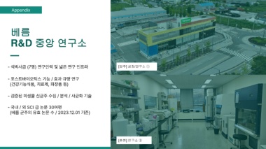 Appendix 베름 R&D 중앙 연구소 - 석박사급 (7명) 연구인력 및 넓은 연구 인프라 [원주] 공장/연구소 ① - 포스트바이오틱스 기능 / 효과 규명 연구 (건강기능식품, 치료제, 화장품 등) - 검증된 미생물 신균주 수집 / 분석 / 사균화 기술 - 국내 / 외 SCI 급 논문 30여편 (베름 균주의 유효 논문 수 / 2023.12.01 기준) [춘천] 연구소 ②