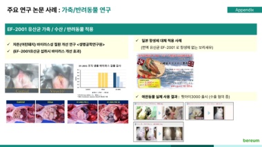 주요 연구 논문 사례 : 가축/반려동물 연구 Appendix EF-2001 유산균 가축 / 수산 / 반려동물 적용 일본 항생제 대체 적용 사례 자돈(어린돼지) 바이러스성 질환 개선 연구 <생명공학연구원> (면역 유산균 EF-2001 로 항생제 없는 보리새우) (EF-2001유산균 섭취시 바이러스 개선 효과) 애완동물 실제 사용 결과 : 펫아이3000 출시 (수출 협의 중)
