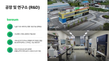 1 g당 7.5조 세계 최고 함량 생산기술 (경제성) 고도화된 스마트 공장에서 직접 생산 석박사급 연구인력 & 산학협력 연구위원단 협업 포스트바이오틱스 스크리닝, 기능 규명 연구 국내 / 외 SCI 급 논문 30여편 (베름 균주의 유효 논문 수-2023.12.01 기준)