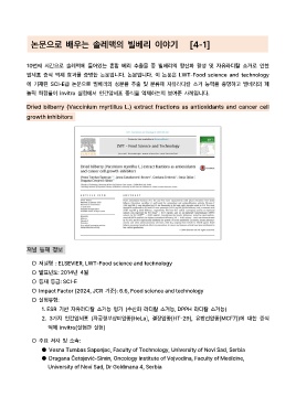 에 기재된 SCI-E급 논문으로 빌베리의 성분을 추출 및 분류해 자유라디칼 소거 능력을 증명하고 빌베리의 페