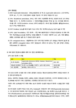 1) SOD: Superoxide dismutase - 활성산소종(ROS) 중 하나인 superoxide radical (O₂⁻·) 을 제거하는