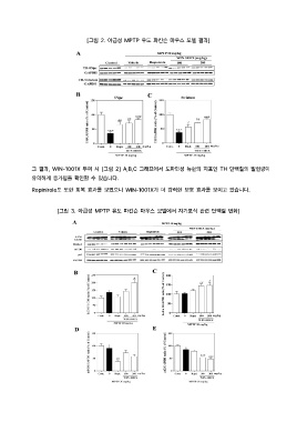 [그림 2. 아급성 MPTP 유도 파킨슨 마우스 모델 결과] 그 결과, WIN-1001X 투여 시 [그림 2] A,B,C 그래프에서 도파민성 뉴런의 지표인 TH 단백질의 발현량이 유의하게 증가됨을 확인할 수 있습니다. Ropinirole도 또한 회복 효과를 보였으나 WIN-1001X가 더 강력한 보호 효과를 보이고 있습니다. [그림 3. 아급성 MPTP 유도 파킨슨 마우스 모델에서 자가포식 관련 단백질 변화]
