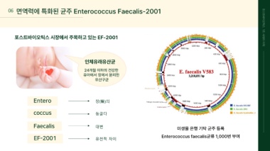 06 면역력에 특화된 균주 Enterococcus Faecalis-2001 포스트바이오틱스 포스트바이오틱스 시장에서 주목하고 있는 EF-2001 1조 시대의 이해 인체유래유산균 24개월 이하의 건강한 유아에서 장에서 분리한 유산구균 &OUFSP 장(腸)의 DPDDVT 둥글다 'BFDBMJT 대변 미생물 은행 기탁 균주 등록 &' 유전적 차이 Enterococcus faecalis균류 1,000번 부여