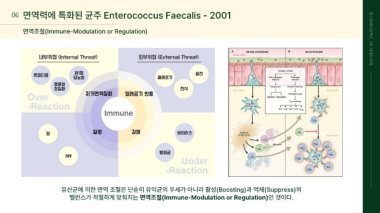06 면역력에 특화된 균주 Enterococcus Faecalis - 2001 면역조절(Immune-Modulation or Regulation) 포스트바이오틱스 1조 시대의 이해 유산균에 의한 면역 조절은 단순히 유익균의 우세가 아니라 활성(Boosting)과 억제(Suppress)의 밸런스가 적절하게 맞춰지는 면역조절(Immune-Modulation or Regulation)인 것이다.