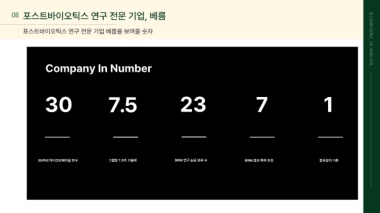 08 포스트바이오틱스 연구 전문 기업, 베름 포스트바이오틱스 연구 전문 기업 베름을 보여줄 숫자 포스트바이오틱스 1조 Company In Number 시대의 이해 30 7.5 23 7 1 30여년 마이크로바이옴 연구 그램당 7.5조 기술력 BRM 연구 논문 보유 수 BRM 효과 특허 보유 효과성의 기준