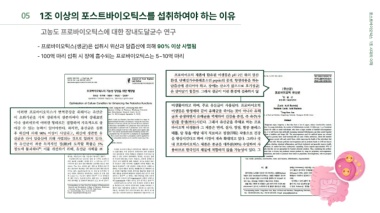 05 1조 이상의 포스트바이오틱스를 섭취하여야 하는 이유 고농도 프로바이오틱스에 대한 장내도달균수 연구 - 프로바이오틱스(생균)은 섭취시 위산과 담즙산에 의해 90% 이상 사멸됨 포스트바이오틱스 1조 시대의 이해 - 100억 마리 섭취 시 장에 흡수되는 프로바이오틱스는 5~10억 마리