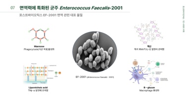 07 면역력에 특화된 균주 Enterococcus Faecalis-2001 포스트바이오틱스 EF-2001 면역 관련 대표 물질 포스트바이오틱스 1조 시대의 이해 Mannose 헥산 Phagocytosis(식균 작용)활성화 특히 RNA가 IL-I2 발현에 관여함 EF-2001 (Enterococcus Faecalis - 2001) Liporeichoic acid Β – glucan TNϝ-α 발현에 관여함 Macrophage 활성화