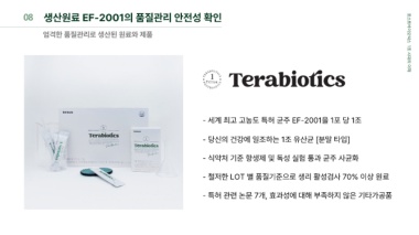 08 생산원료 EF-2001의 품질관리 안전성 확인 엄격한 품질관리로 생산된 원료와 제품 포스트바이오틱스 1조 시대의 이해 - 세계 최고 고농도 특허 균주 EF-2001을 1포 당 1조 - 당신의 건강에 일조하는 1조 유산균 [분말 타입] - 식약처 기준 항생제 및 독성 실험 통과 균주 사균화 - 철저한 LOT 별 품질기준으로 생리 활성검사 70% 이상 원료 - 특허 관련 논문 7개, 효과성에 대해 부족하지 않은 기타가공품